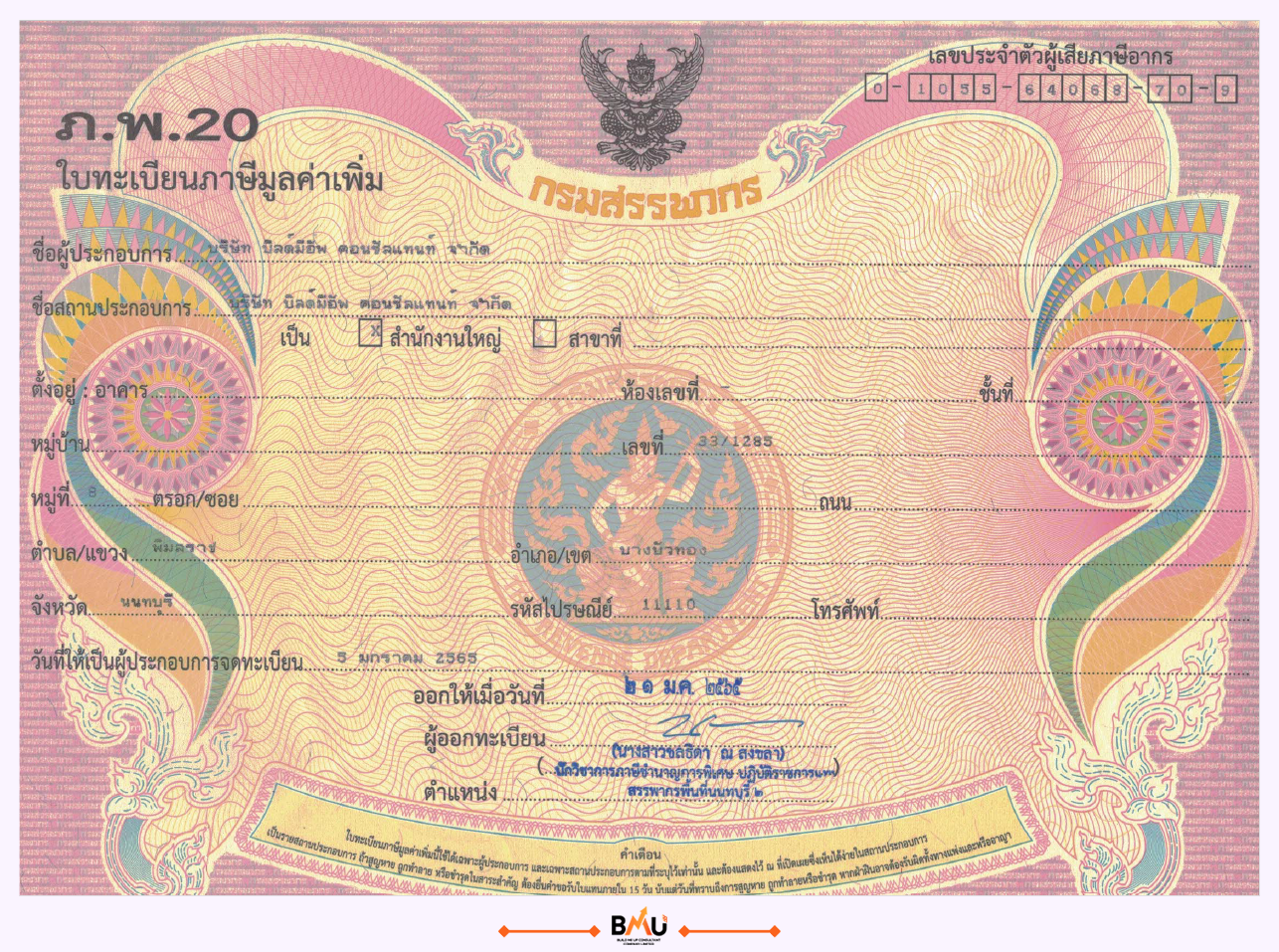 จุดเริ่มต้นของการจด Vat คือ ใบ ภพ.20 ใบทะเบียนภาษีมูลค่าเพิ่ม ซึ่งเป็นเอกสารที่ยืนยันว่าบริษัทได้เข้าสู่ระบบภาษีมูลค่าเพิ่มเรียบร้อยแล้ว วันนี้ทาง Build Me Up Consultant (BMU) จะมาอธิบายว่า ภพ.20 คืออะไร และมีวิธีการได้มาซึ่งเอกสารดังกล่าวอย่างไร