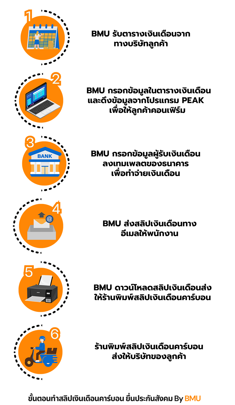1.BMU รับตารางเงินเดือนจากทางบริษัทลูกค้า โดยในตารางเงินเดือน ต้องประกอบด้วยรายละเอียด ดังนี้